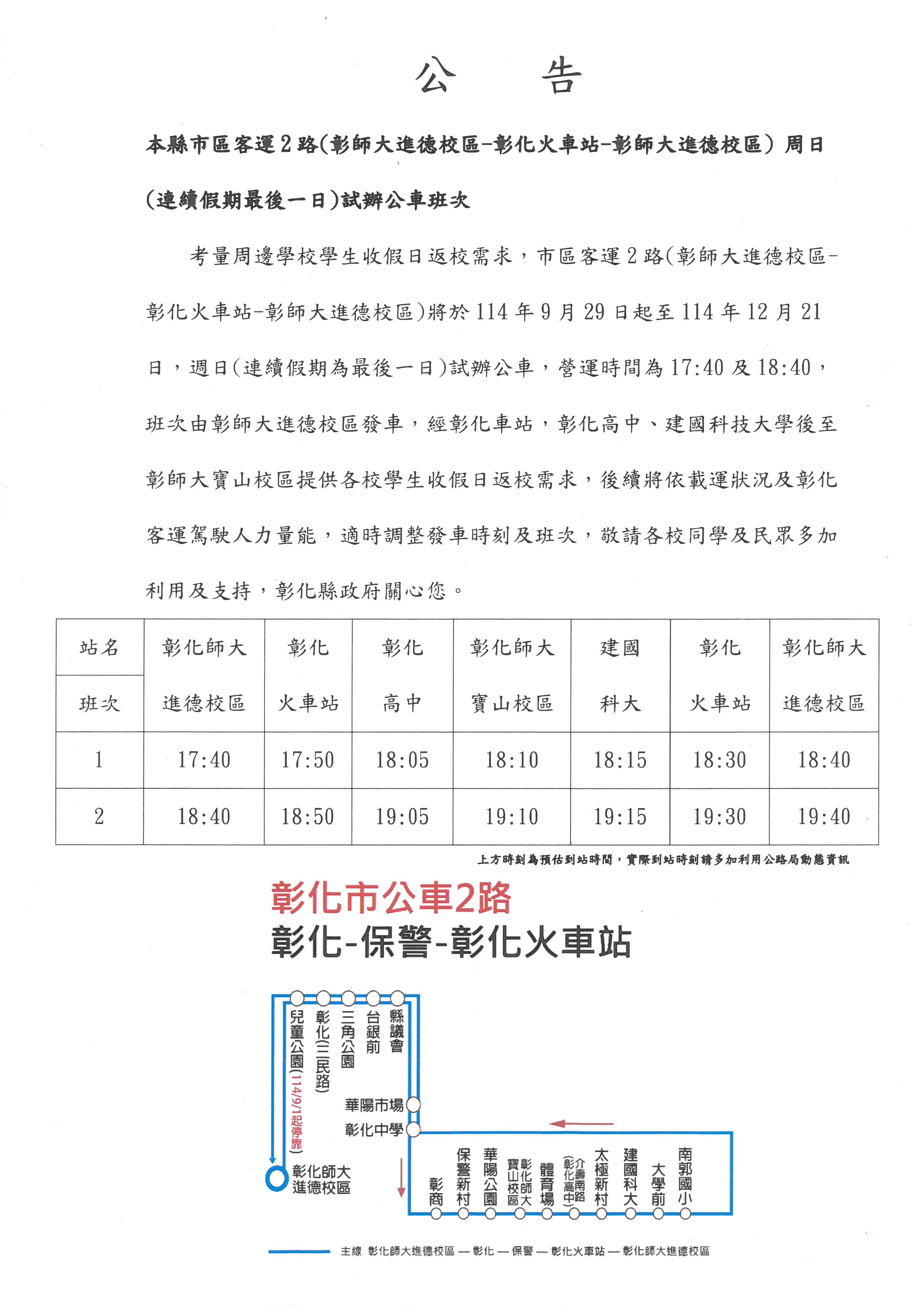 轉知:彰化縣政府交通處公共運輸辦公室於周日(連續假期最後一日)試辦公車班次,歡迎住宿同學多加利用