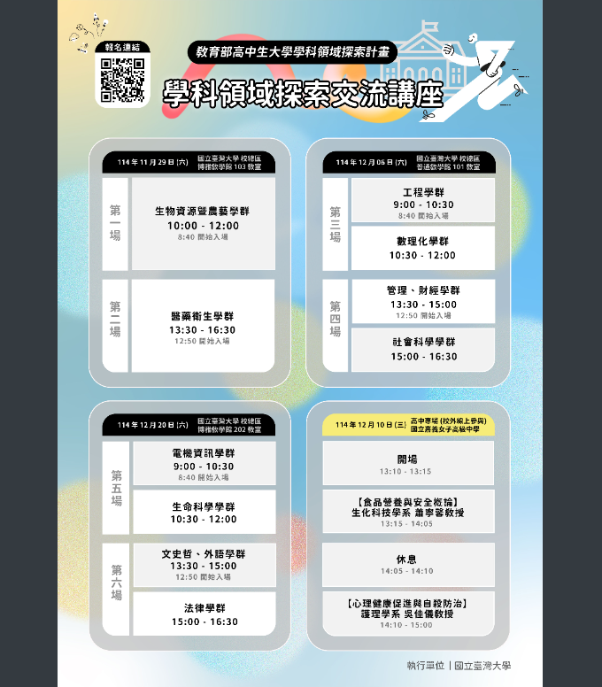 二、旨揭「學科領域探索交流講座」計7場次,其中114年12月10日高中專場僅開放線上參加,其餘6場次均採實體和線上同步方式進行,各場次資訊如下: