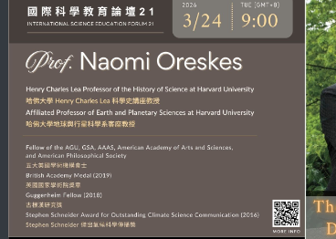 二、《國際科學教育論壇系列21》活動訊息如下:(一)講者:Prof. Naomi Oreskes(哈佛大學Henry CharlesLea科學史講座教授)。(二)講題:The Many Sources of Distrust in Science(and How to Address Them)。(三)主持人:葉永烜教授(國立中央大學天文研究所)。(四)時間:115年3月24日,上午9時(GMT+8)。三、報名方式:敬請於以下連結完成線上報名:https://forms.gle/AEWQv1WHKLKcxUNNA。