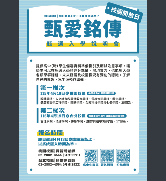 二、4/18(週六)桃園校區設計學院、電機資訊學院、觀光學院、人文社會科學暨教育學院、健康暨醫學工程學院、國際學院、金融科技學院共7個學院25個系;及4/20(週日)台北校區管理學院、法律學院、傳播學院、國際學院共4個學院17個系辦理「甄愛銘傳-甄選入學說明會」校園開放日,即日起開始接受報名,額滿為止。